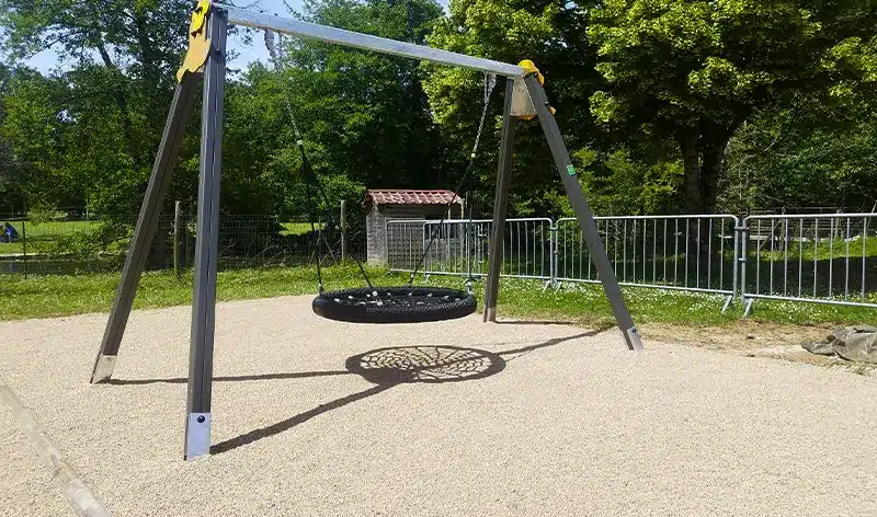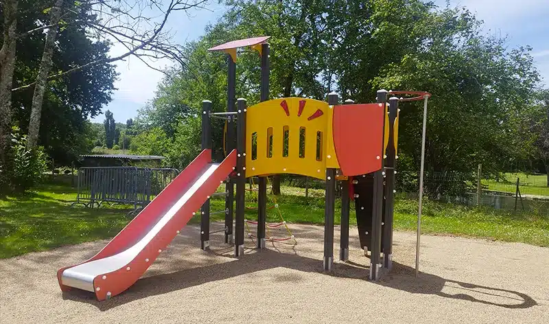 Une aire de jeu avec une grande structure gonflable est installée sur le camping. Ses avantages : de nombreux jeux sont disponibles, situés à proximité de la piscine, du ✨terrain de pétanque et du restaurant, et l’accès à la rivière est sécurisé par un grillage !